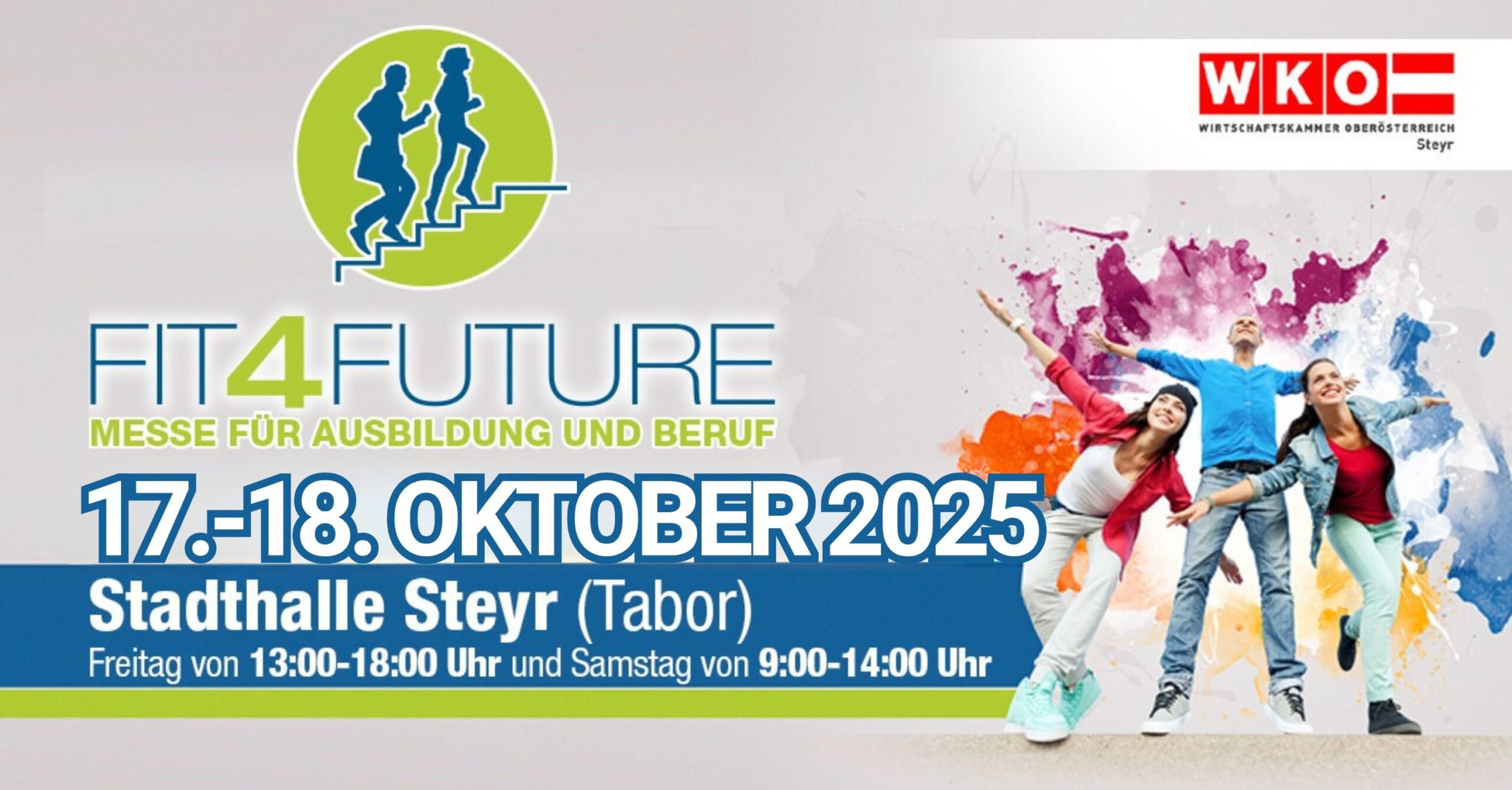 Wir freuen uns, Sie auf der Fit4Future in der Stadthalle Steyr/Tabor begrüßen zu dürfen! Als Aussteller sind wir am 17.10.2025 von 13 bis 18 Uhr und am 18.10.2025 von 9 bis 14 Uhr auf der Messe für Ausbildung und Beruf vertreten.